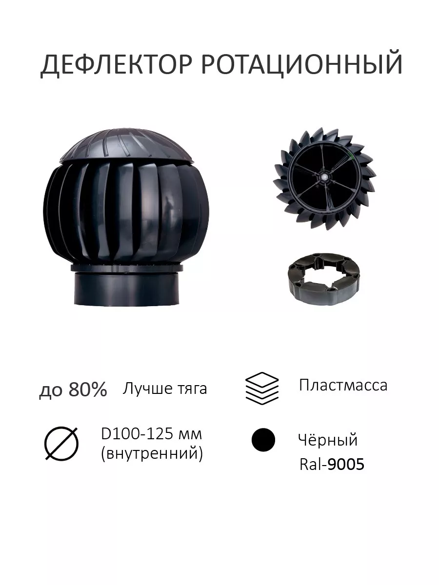 ND160 с манжетой - Нанодефлектор/Турбодефлектор (Ротационный дефлектор) с резиновой манжетой для установки на трубы диаметром от 100 до 125 мм. Изготовлен из АБС уф-стабилизированного пластика. Работает от силы ветра и не потребляет электричество. Посадочное место 160 мм. Подходит для установки на трубы от 100 мм до 200 мм диаметром через переходники. Не выцветает, не подвержен коррозии, работает полностью бесшумно, идеально сбалансирован, не создает вибраций вытяжной трубы, не допускает задуваний внутрь вытяжной трубы, оснащен уровнем для удобства установки. Срок службы не менее 10 лет. Переходник изготовлен из поливинилхлорида. Устанавливается на трубу без усилий. Не теряет своих свойств на жаре и морозе. Не требует специальных крепежей, так как просверливается саморезами, которыми крепится сам нанодефлектор к трубе.