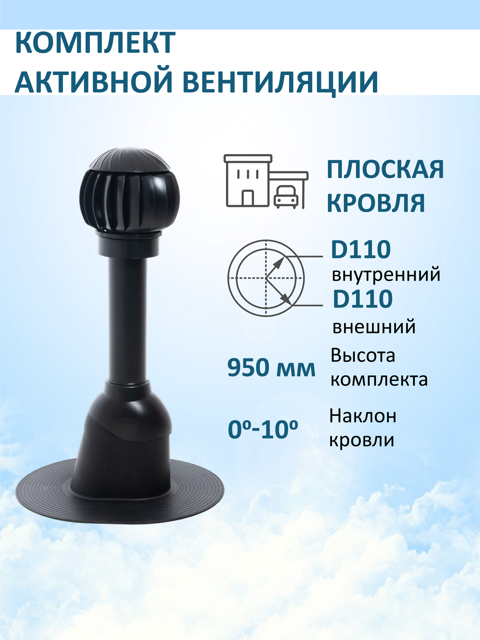 Комплект активной вентиляции: Нанодефлектор ND160 с манжетой, вент.выход 110 не утепленный, проходной элемент для плоской кровли - служит для увеличения тяги в вентиляционном канале частного или многоквартирного дома, в погребе, гараже, курятнике, коровнике, конюшне, предбаннике, в парилке бани, внешней вентиляции септика и складских помещениях.