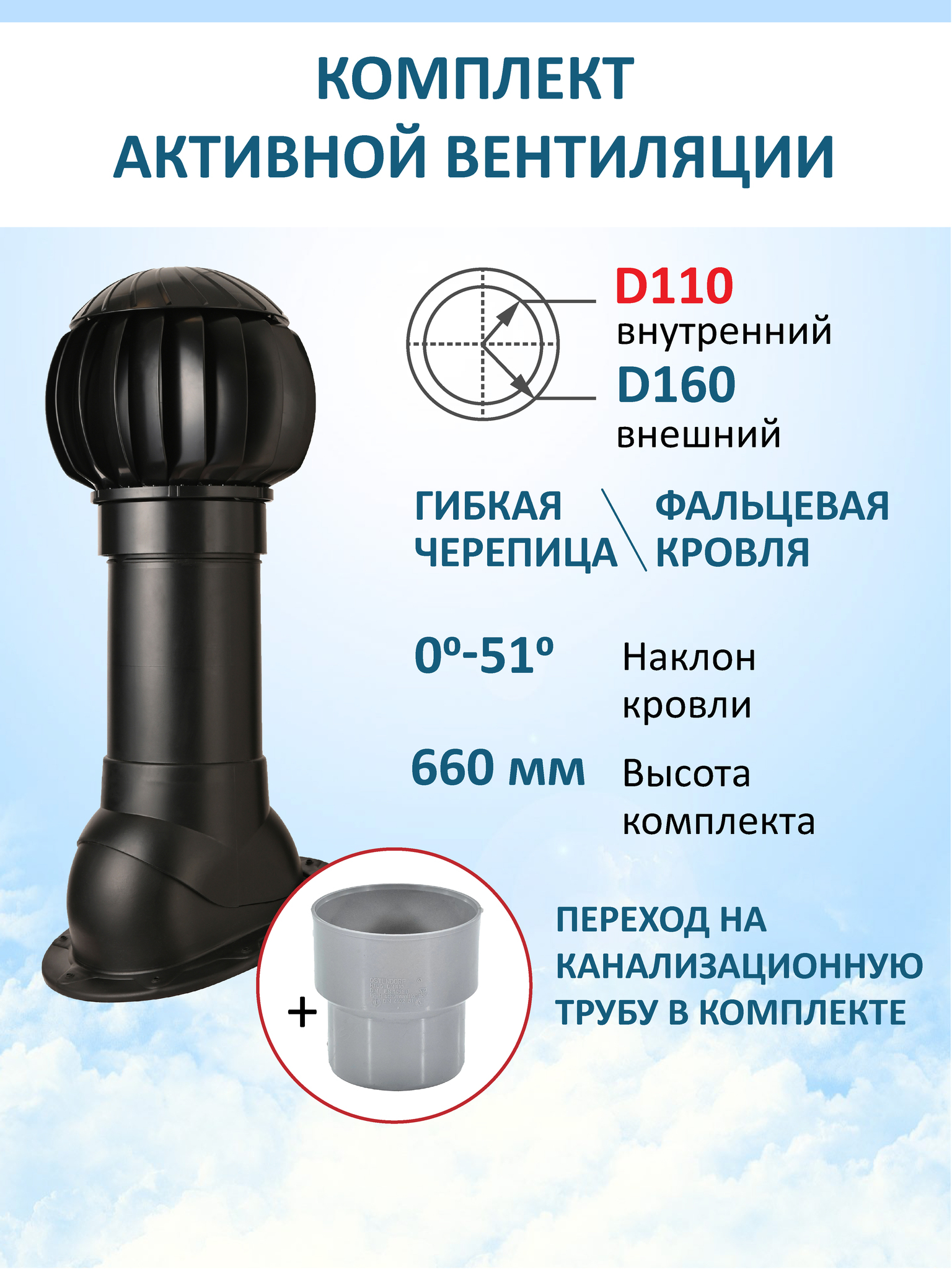 Комплект активной вентиляции: Нанодефлектор ND160, вент. выход утепленный H-500 с переходом D110, для скатной кровли - служит для увеличения тяги в вентиляционном канале частного или многоквартирного дома, в погребе, гараже, курятнике, коровнике, конюшне, предбаннике, в парилке бани, внешней вентиляции септика и складских помещениях.