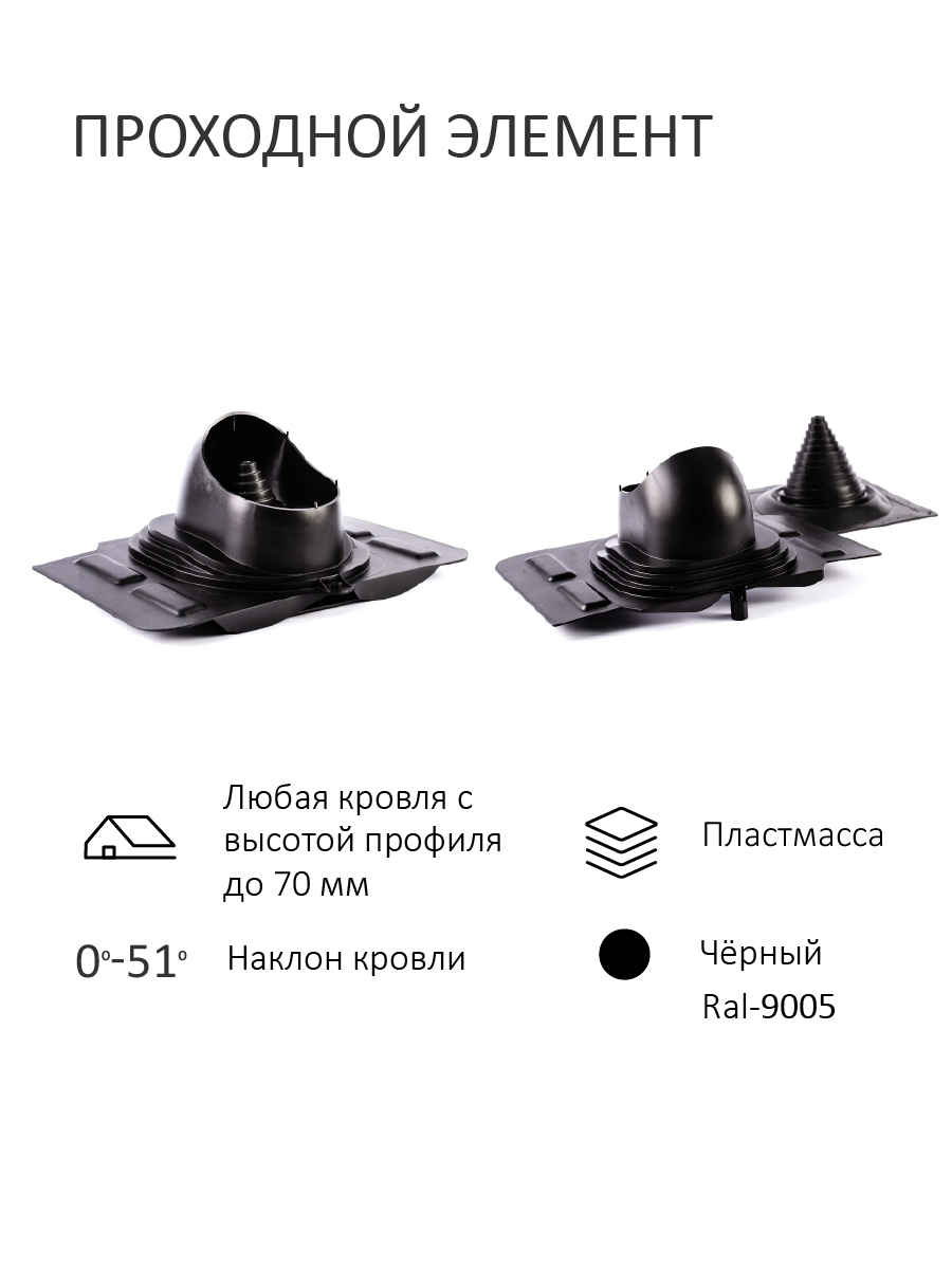 U - Проходной элемент UNIVERSAL применяется на кровлях из металлочерепицы или на других типах покрытия скатных кровель с любым типом профиля с высотой до 70 мм (в том числе и натуральная черепица при использовании сверла по стеклу и керамике, и саморезов для кирпича) для установки вентиляционных труб.