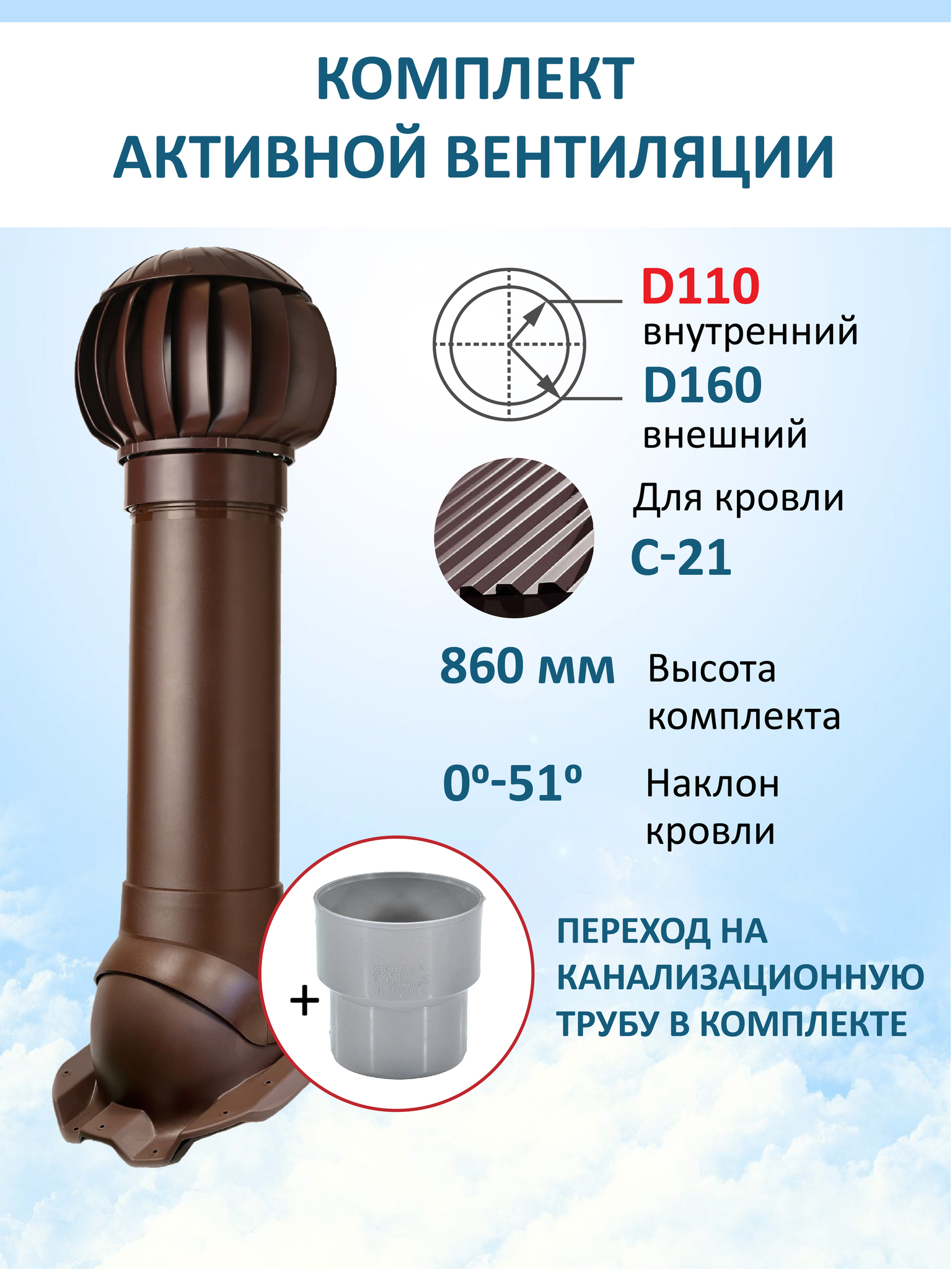 Комплект активной вентиляции: Нанодефлектор ND160, вент. выход утепленный высотой Н-700 с переходом D110, для кровельного профнастила С-21 мм - служит для увеличения тяги в вентиляционном канале частного или многоквартирного дома, в погребе, гараже, курятнике, коровнике, конюшне, предбаннике, в парилке бани, внешней вентиляции септика и складских помещениях.