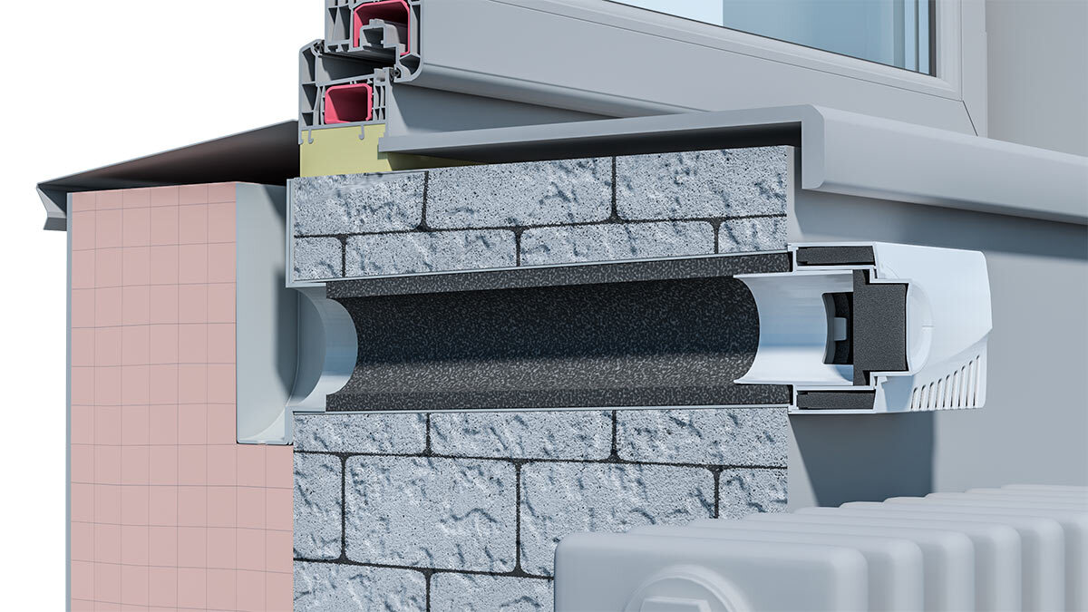 Для установки короба требуется создать углубление в стене здания, а на этапе строительства, независимо от технологии утепления фасада, необходимо предусмотреть место для размещения короба. При необходимости короб можно укоротить, отрезав его верхнюю часть. При установке оконного отлива следует обеспечить зазор в 5-10 мм между отливом и стеной, который не виден, поскольку перекрывается капиносом отлива.