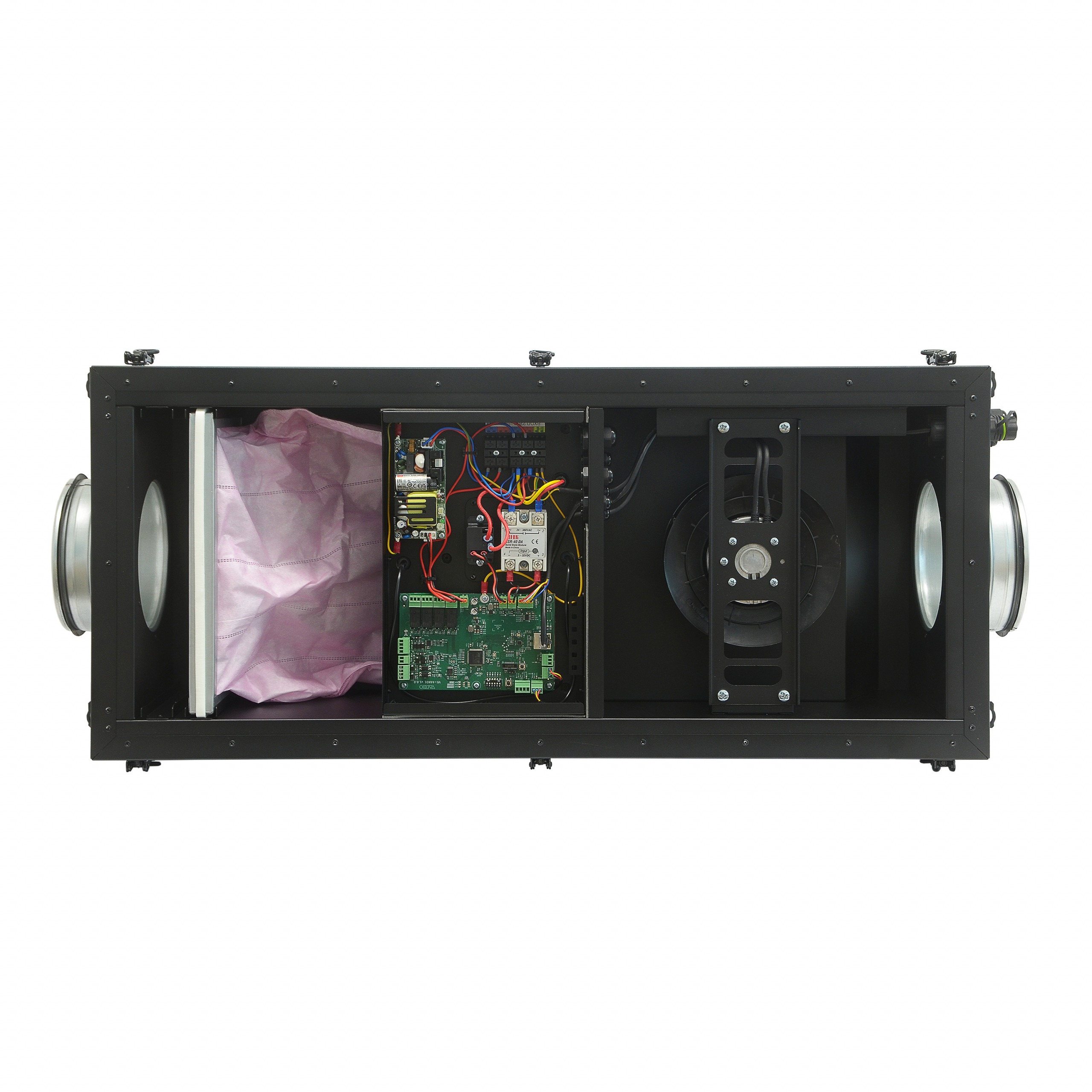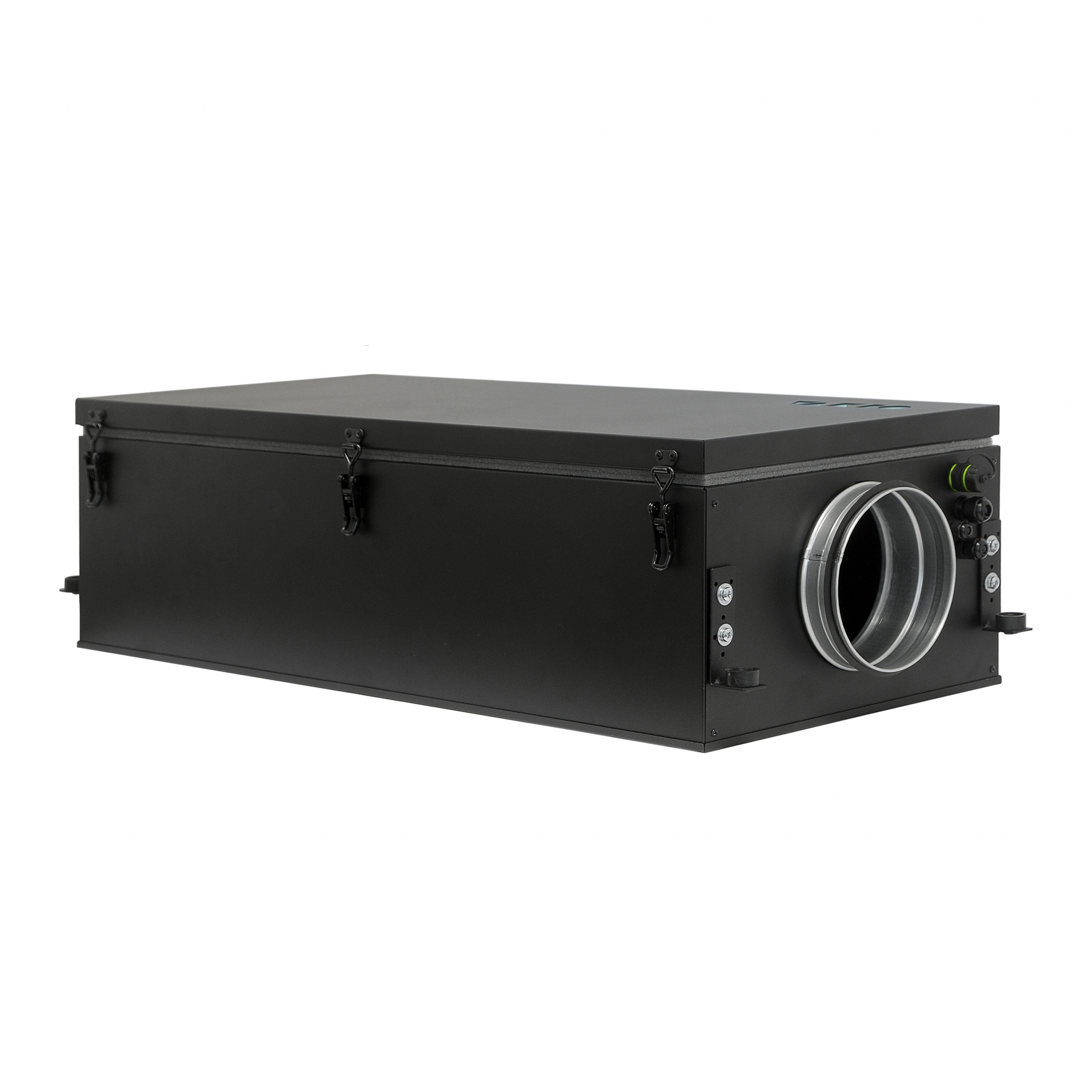 Приточная установка, втягивает воздух с улицы и подаёт его в помещение. Перед приточной установкой рекомендуется смонтировать электромеханический воздушный клапан (не идёт в комплекте), который открывается при включении установки. После запуска установки имеется задержка по времени до включения вентилятора, равная 70 секунд. Внутри установки воздух проходит через фильтр. Поступающий из установки воздух предварительно подогревается электронагревателем. После выключения установки клапан закроется по завершении работы вентилятора.