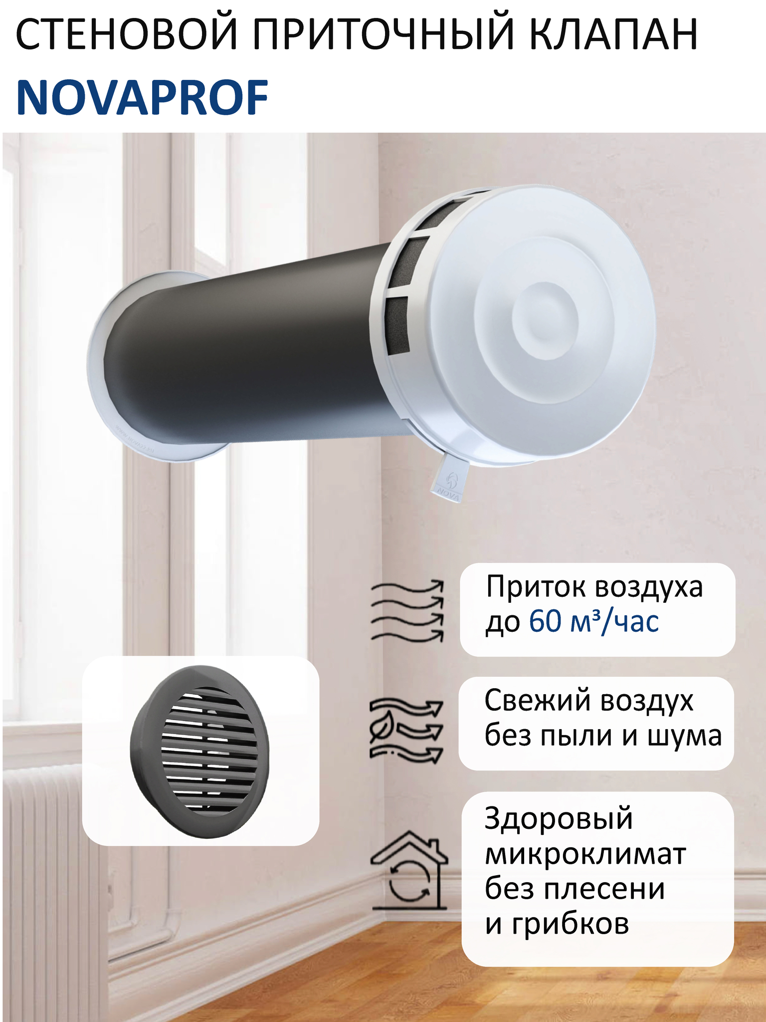Простота в использовании позволяет легко регулировать подачу воздуха, а высокая производительность до 60 м³ в час обеспечивает комфортный микроклимат в помещении. Компактные размеры и современный дизайн приточного клапана NovaPROF позволяют ему гармонично вписаться в любой интерьер, при этом конструкция не допускает проникновения уличного шума и сохраняет тепло внутри.