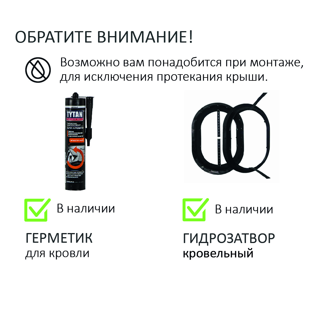 В комплекте имеется битумный герметик (жгут), который обеспечивает герметичность соединения при фиксации проходного элемента к кровле саморезами.