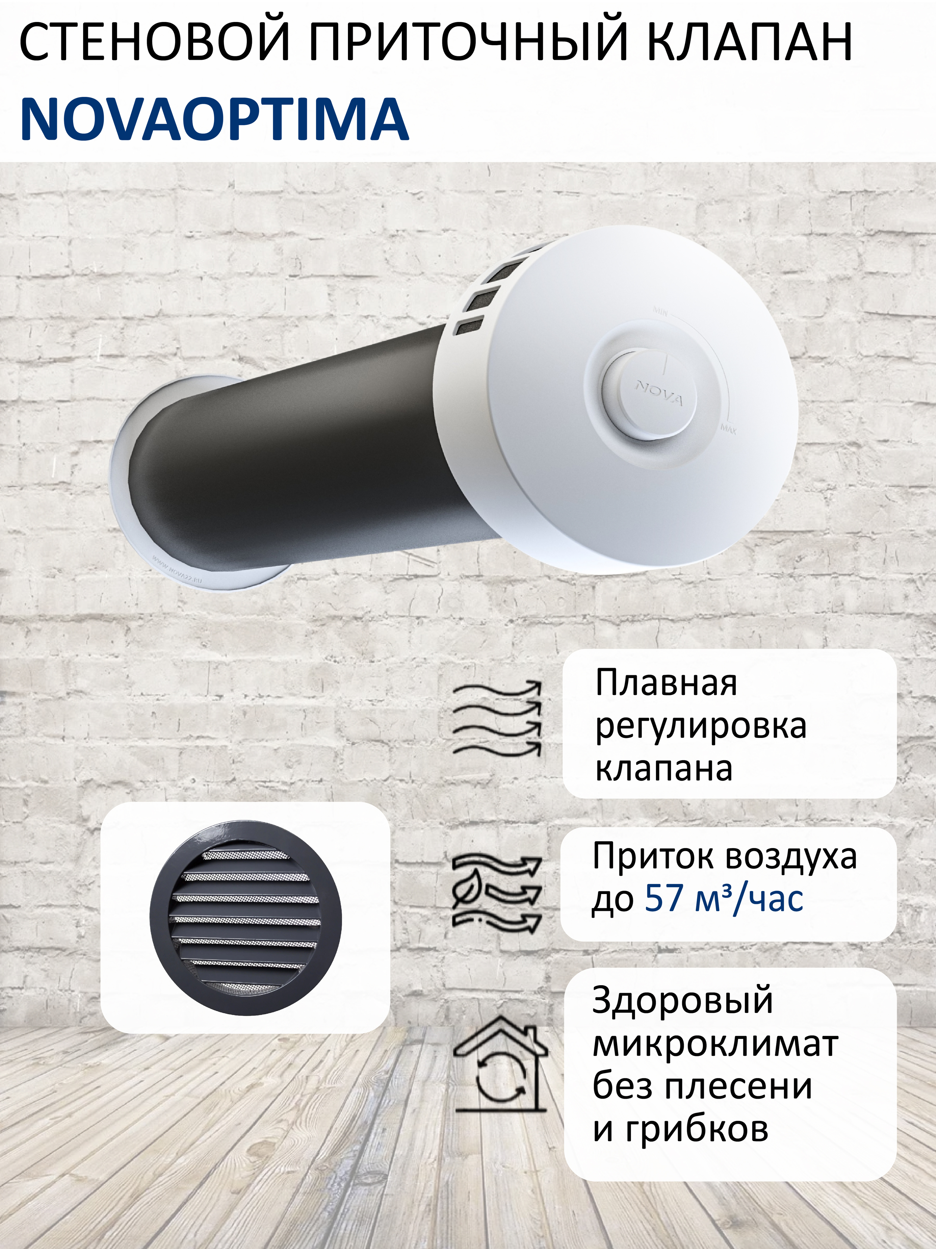 Вентиляционный стеновой клапан NovaOPTIMA с шумозащитной функцией, вентиляционным каналом длиной 0,5 м, фильтром класса G3 и алюминиевой решеткой для фасада. Вентиляционный прибор предотвращает запотевание на окнах и образование конденсата, улучшает микроклимат в помещении и обеспечивает воздухообмен без сквозняков. Клапан оснащен фильтром класса G-3, который задерживает до 90% частиц размером до 10 мкм, обеспечивая чистый и свежий воздух в помещении.