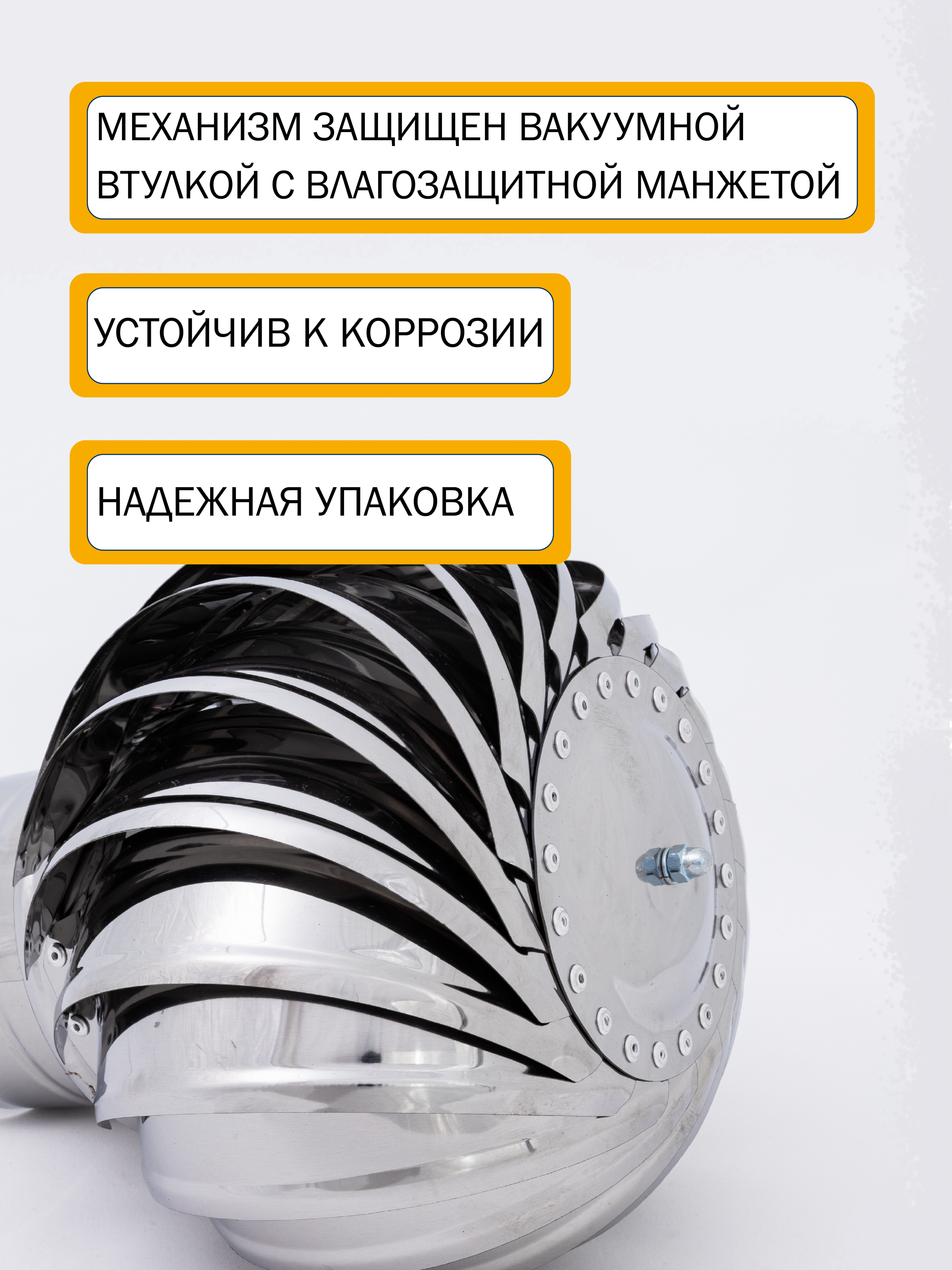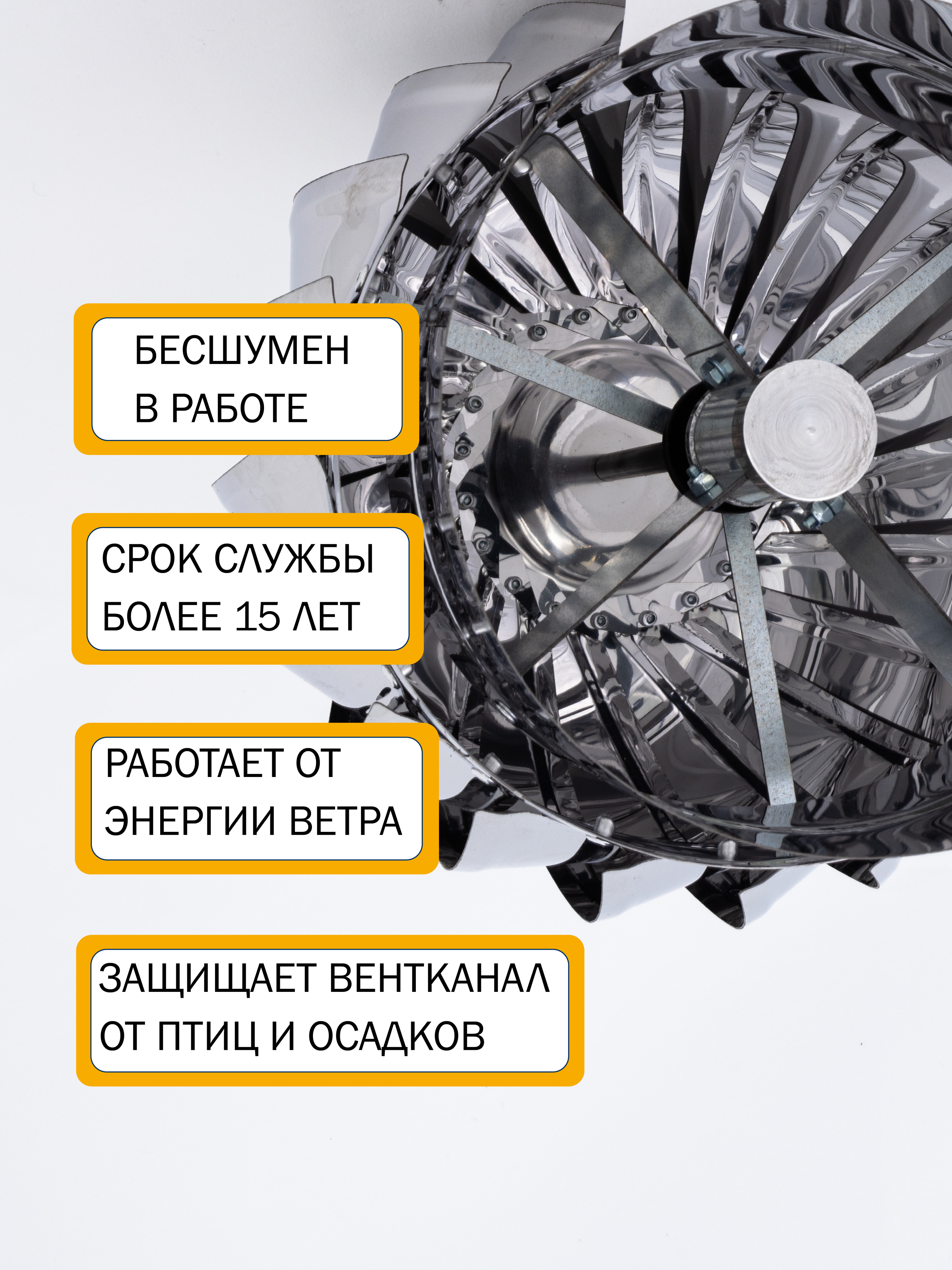 -Активная головка дефлектора вращается под воздействием ветра, создавая разряжение в вентиляционном канале, что способствует усилению тяги
