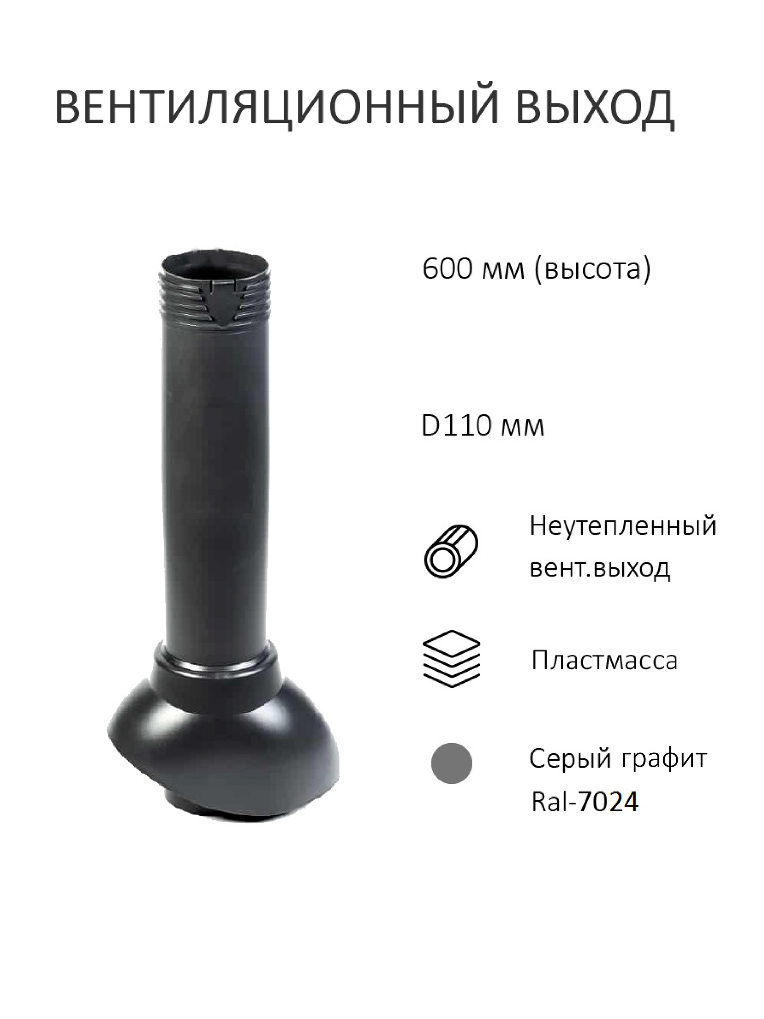 VV110 - Вентиляционный выход (не утепленный) высотой 500 мм, наружный диаметр 110 мм. Применяется для обеспечения проветривания канализационной системы, для удаления всех запахов и паров, образующихся при приготовлении пищи. Рекомендуем применять на кровлях летних домов. Имеет снизу посадочную юбку на проходной элемент и сверху резьбу для фиксации колпака. Имеет в комплекте саморезы для фиксации к проходному элементу.