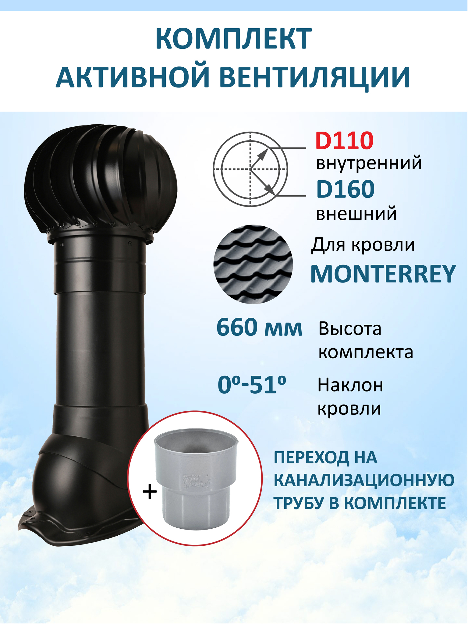 Комплект активной вентиляции: Турбодефлектор TD160, вент. выход утепленный высотой Н-500 с переходом D110, для металлочерепицы Monterrey - служит для увеличения тяги в вентиляционном канале частного или многоквартирного дома, в погребе, гараже, курятнике, коровнике, конюшне, предбаннике, в парилке бани, внешней вентиляции септика и складских помещениях.