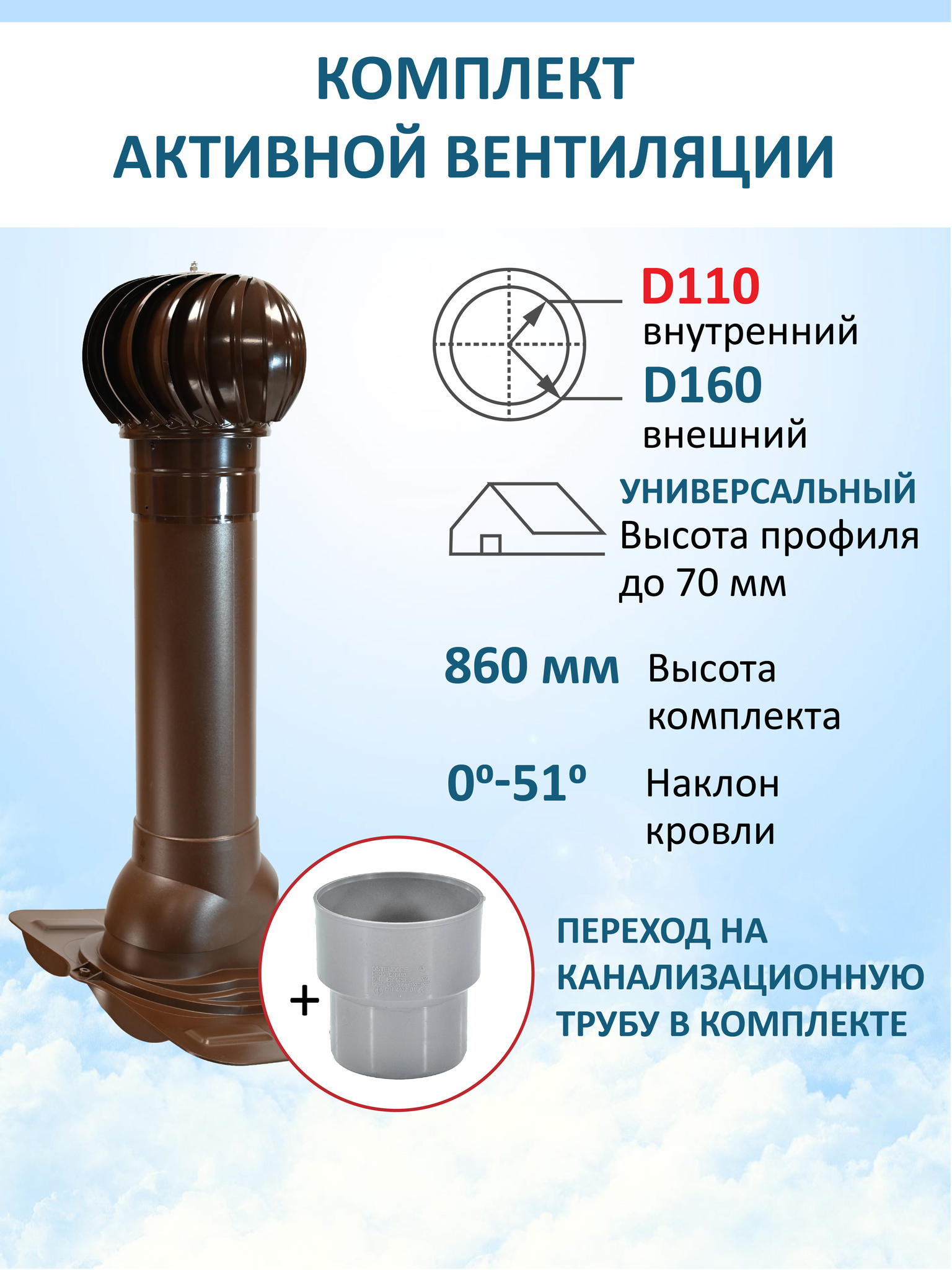 Комплект активной вентиляции: Турбодефлектор TD160, вент. выход утепленный высотой Н-700 с переходом D110, проходной элемент универсальный, коричневый - служит для увеличения тяги в вентиляционном канале частного или многоквартирного дома, в погребе, гараже, курятнике, коровнике, конюшне, предбаннике, в парилке бани, внешней вентиляции септика и складских помещениях.