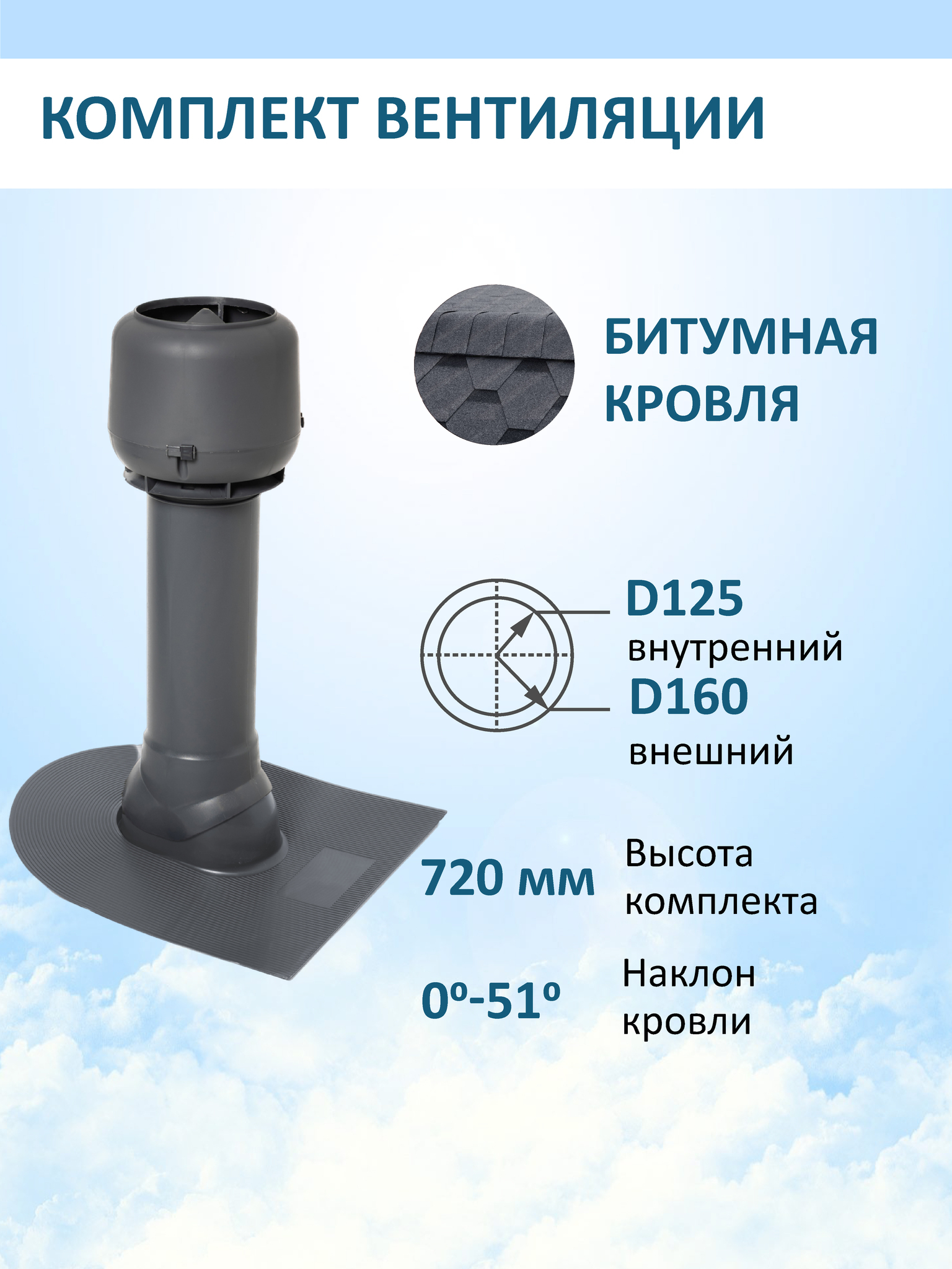 Комплект вентиляции: Вентиляционный выход изолированный D125/160/700 утепленный, проходной элемент для битумной кровли, колпак вентиляционный TP D 160 мм, серый