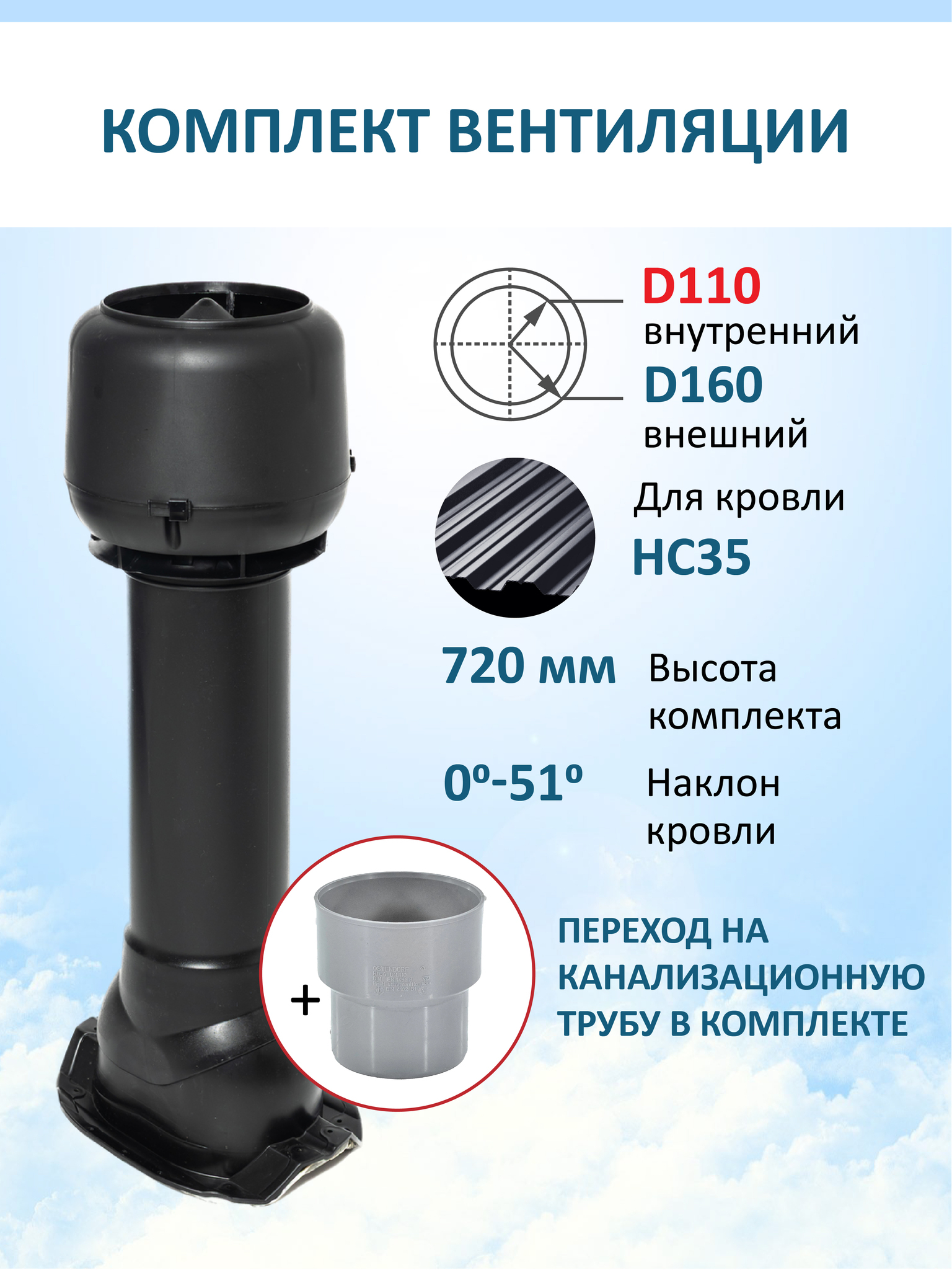 Комплект вентиляции: Вент. выход утепленный c колпаком D160 высотой Н-700 с переходом D110, для кровельного профнастила 35мм - служит для создания вытяжки в вентиляционном канале частного или многоквартирного дома, в погребе, гараже, курятнике, коровнике, конюшне, предбаннике, в парилке бани, внешней вентиляции септика и складских помещениях.