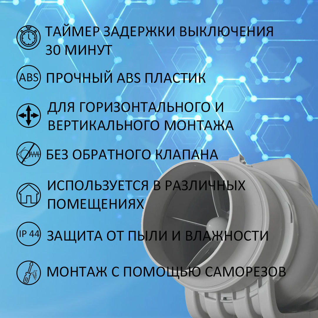 Канальный вентилятор 100 не имеет обратного клапана. Кнопка переключения в комплекте, подключается отдельно. Кабель питания в комплект поставки не входит и приобретается отдельно!